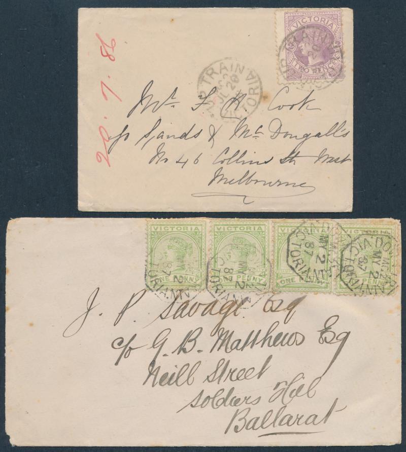 'UNCLAIMED AT/...'), 1887 octagonal 'DOWN TRAIN/ MG2 /...' etc, condition variable but the strikes are generally fine to fine.