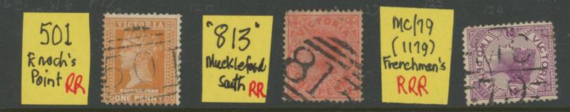 '808'), 'JERUK' (also with 'BARRAKEE'), 'KORONGVALE' (one word), 'LEOPOLD HILL', 'LOWER BUCKLAND' (with superb '779'), 'MORTON PLAINS', 'MUSK CREEK' (with 'MC/1'), crowned-oval 'PORT FAIRY/NSW' (with boxed 'PAID AT/PORT FAIRY' on the face), 'POWLETT