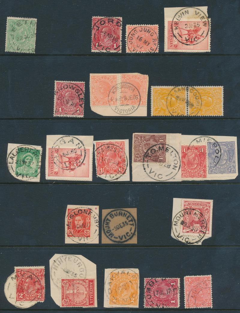 including 'TO COLDSTREAM', 'EDEN HILLS', rare 'HARTWELL E6' (changed to 'E13' circa 1960), superb 'MOORNGAG', 'STOCKYARD HILL', 'TANNAHILLS', 'TOWANINNIE', 'WYELANGTA', good range of Money Order (MO) types, etc, oddments from other States, a high