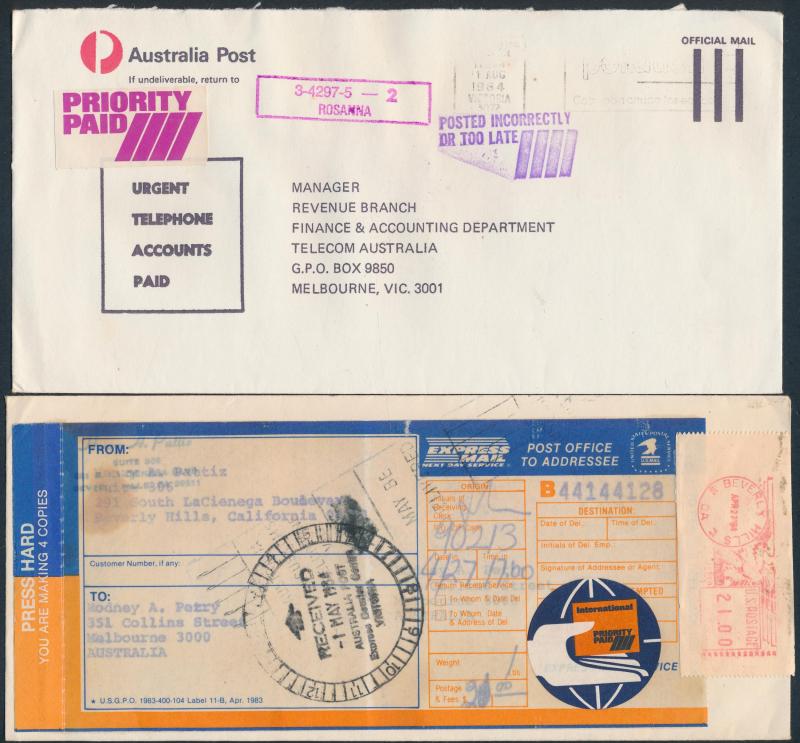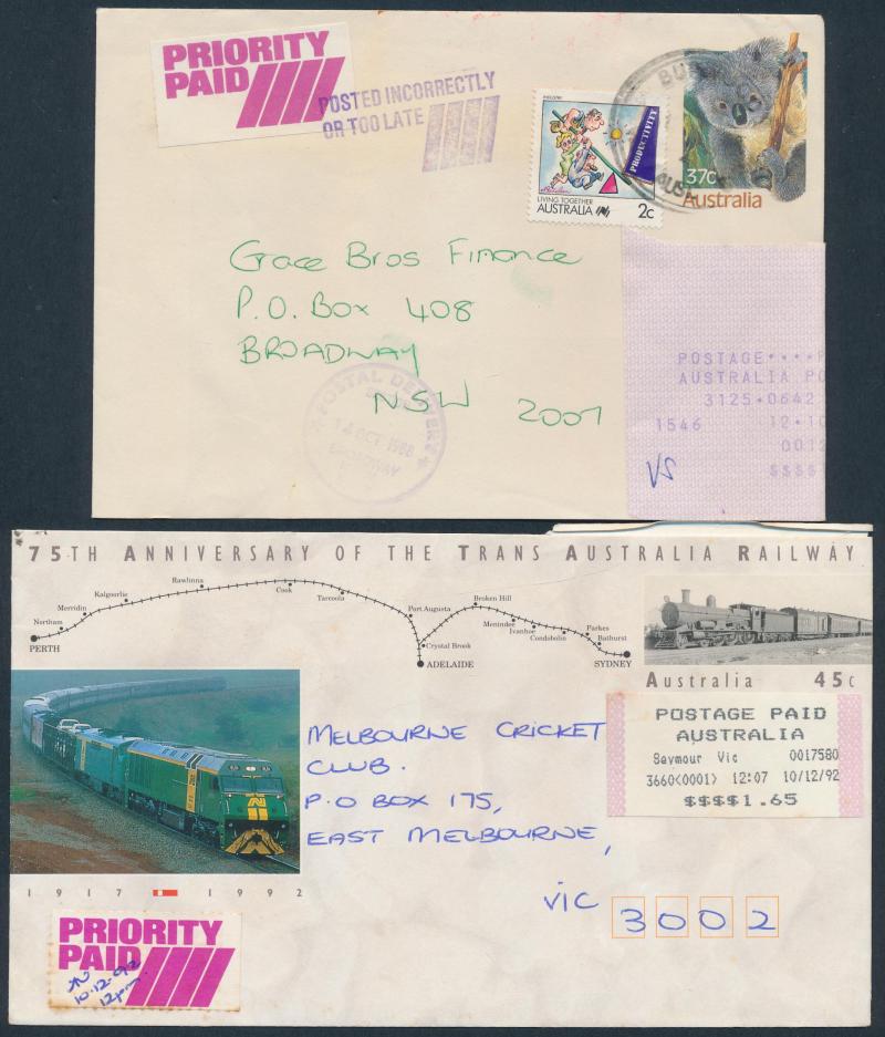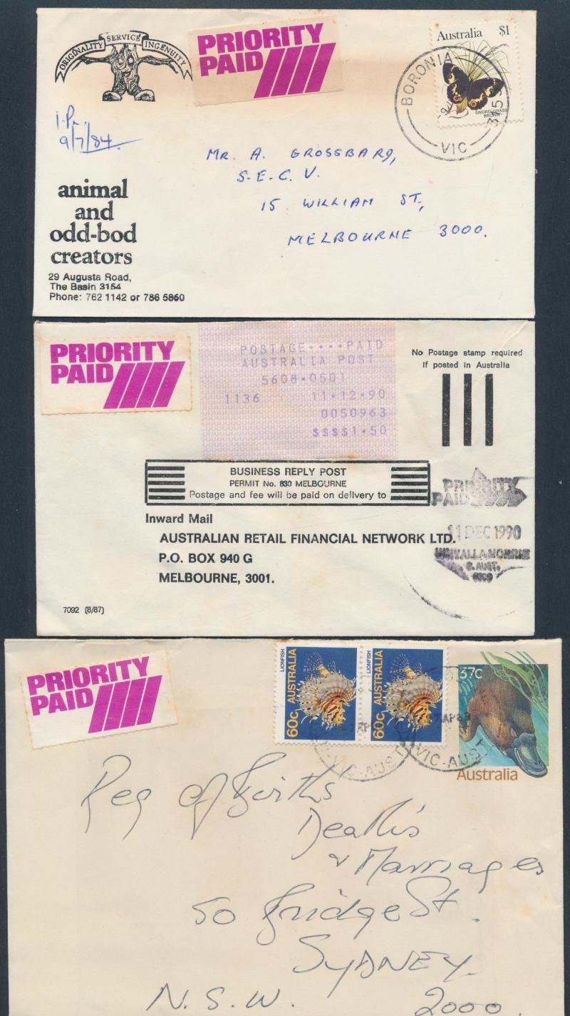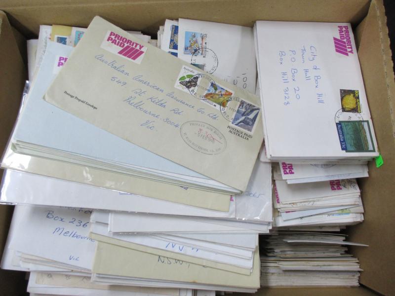 Priority Paid accumulation of 1970s-90s material with a wide variety of standard, 'time-clock' & rubber postmarks from all over the