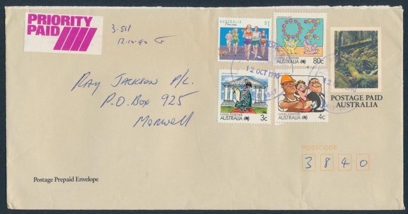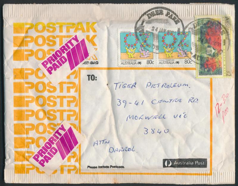 Melbourne Suburbs with many from smaller offices with Postal Area Codes & others with the codes removed, other small offices including 'ERINBANK', 'EVERTON UPPER', 'LARUNDEL/1JY47/VIC-AUST' (near Manangatang; Opening Day), 'MANIFOLD', 'NORADJUHA',