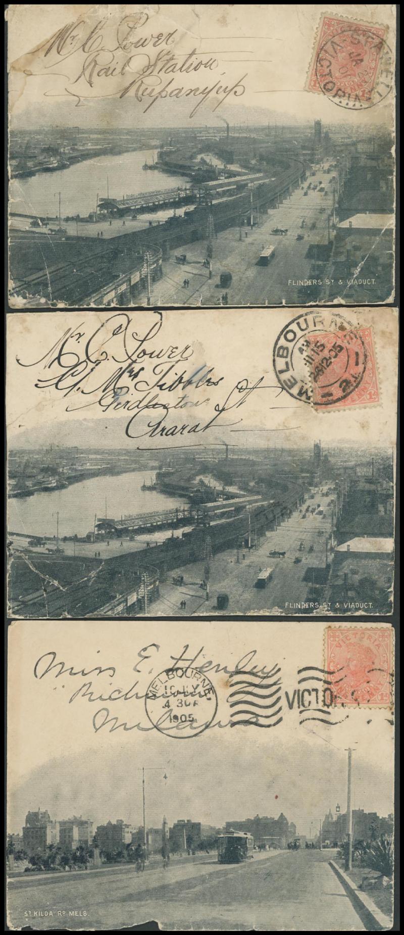 Gardens Melb', 'Collins St Melb' & 'Exhibition Buildings Melb', used with lots of soiling but all presentable. Very scarce.
