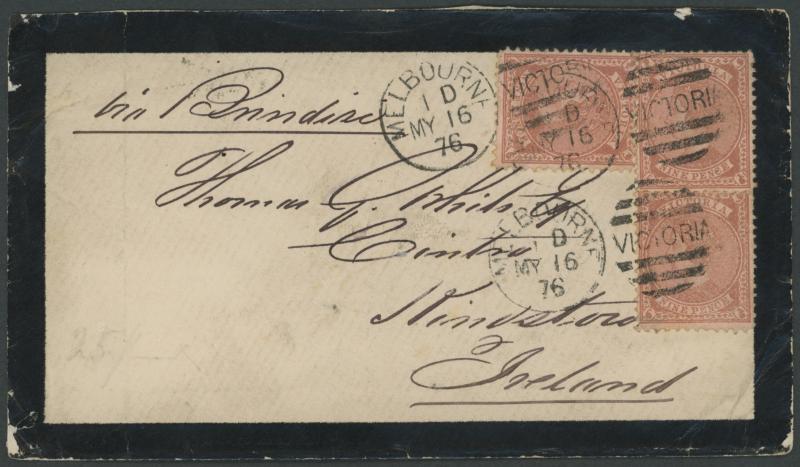 1876 (May 16) triple-rate mourning cover to "Kingstown/Ireland" with scarce franking of Bell 9d lilac-brown/pink Perf 12 SG 185