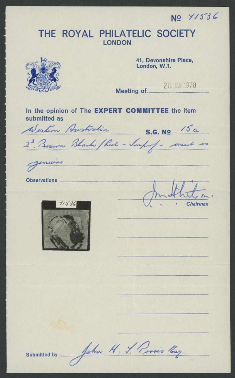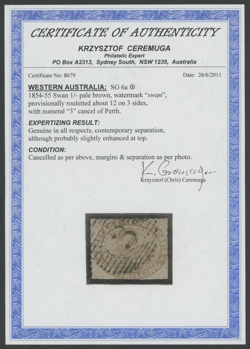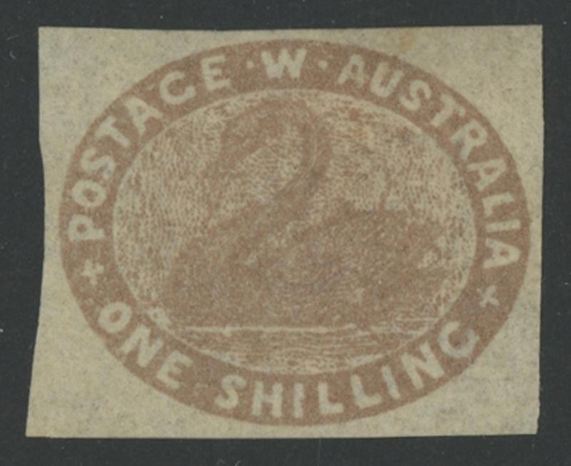 1854-55 Lithographs Imperforate Swan 1/- pale brown SG 4c, margins close to good, unused, Cat £550. David Brandon Certificate