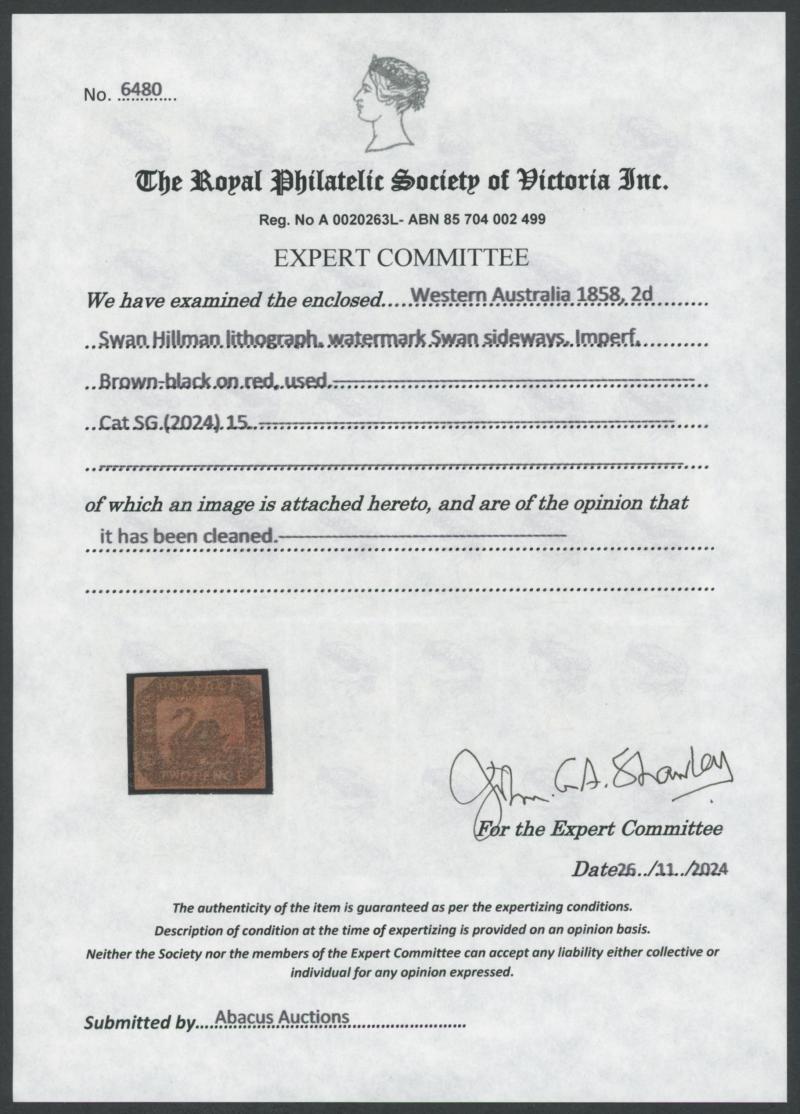 1857-59 Hillman Lithographs Imperforate Swan 2d brown-black/red SG 15, good colour, margins close to just touching, unused, Cat