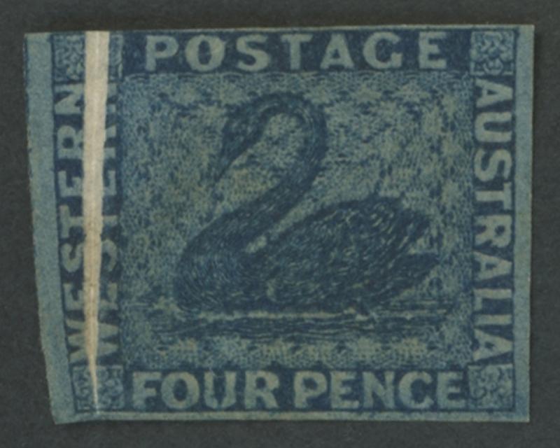 1860-64 Printed in the Colony from Perkins Bacon Plates Imperforate Swan 4d deep blue SG 27 with Pre-Printing Paper Fold through