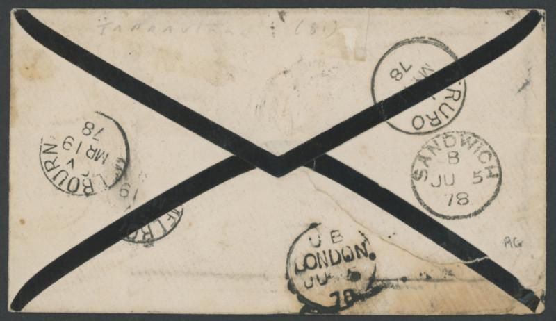 SG 199 pair & single (Cat £150 x3+) tied by just-discernible Barred Numeral '81' and light but fine 'TARRAVILLE' cds alongside, Truro arrival of 'MY 14' on reverse where re-directed to Kent with London & Sandwich transit backstamps and 'WINGHAM/JU