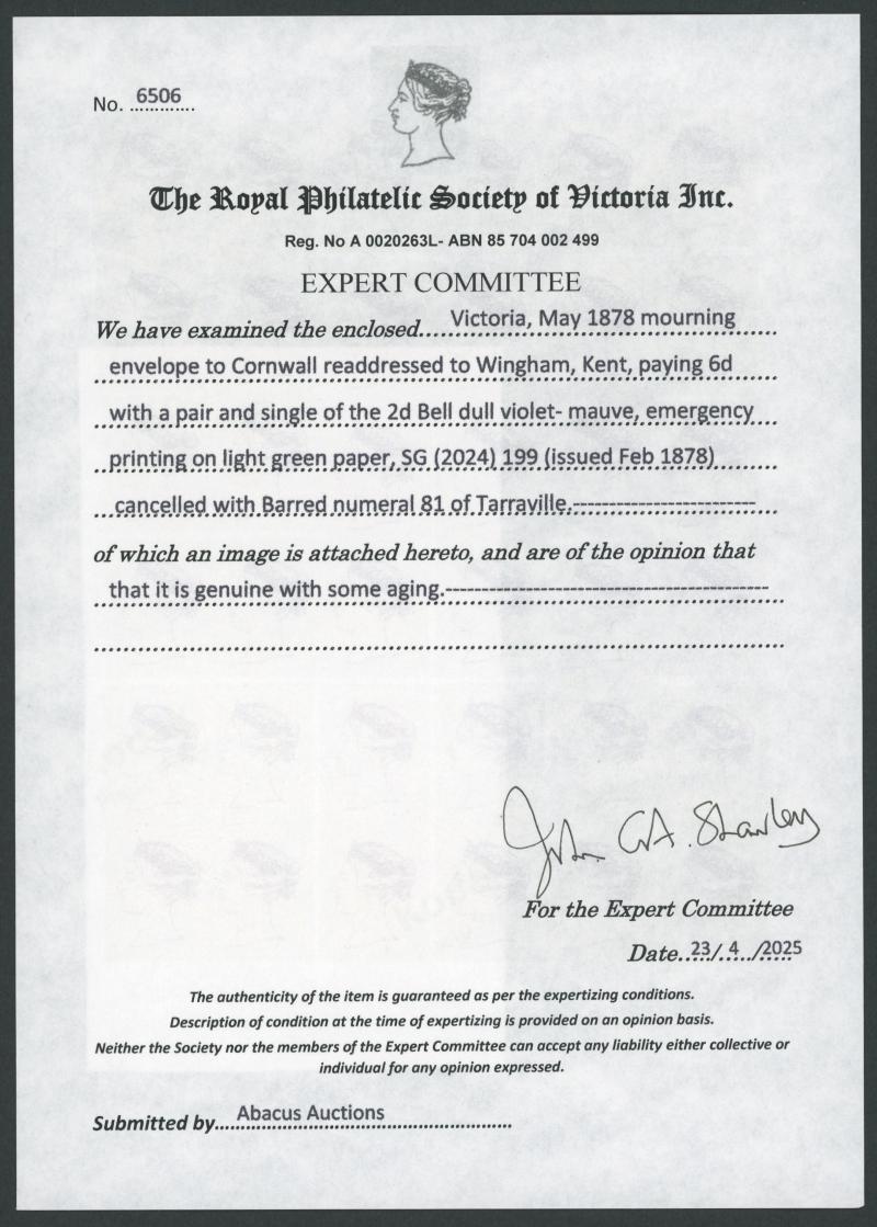 5/78' arrival on the face, a couple of minor blemishes. Gibbons states that the Emergency Printings on green paper were issued in February 1878. RPSV Certificate (2025). (Image1) (Image2)
