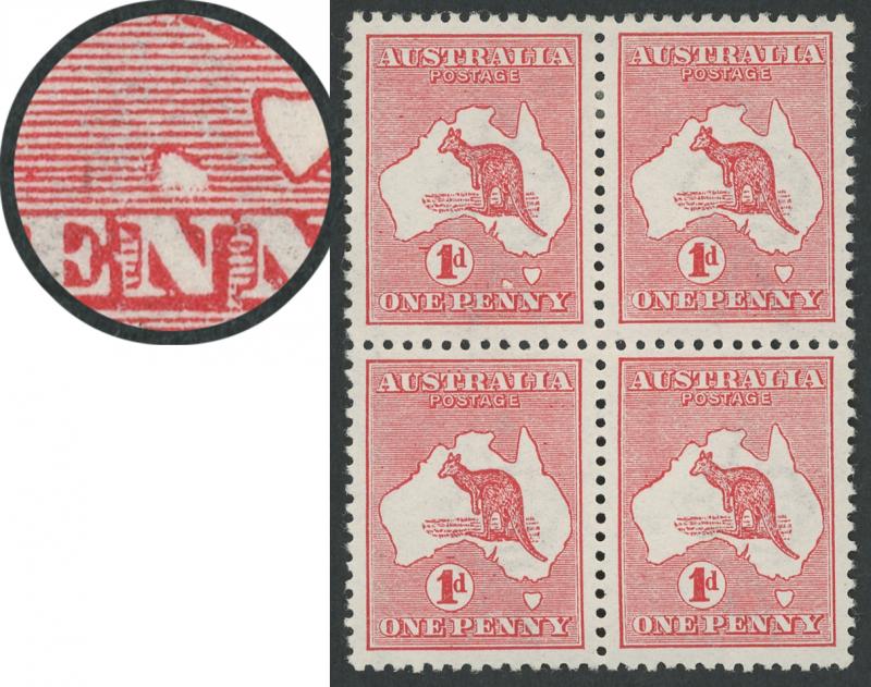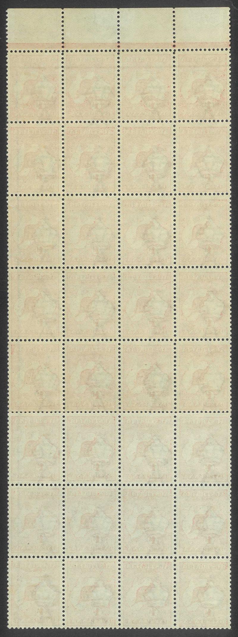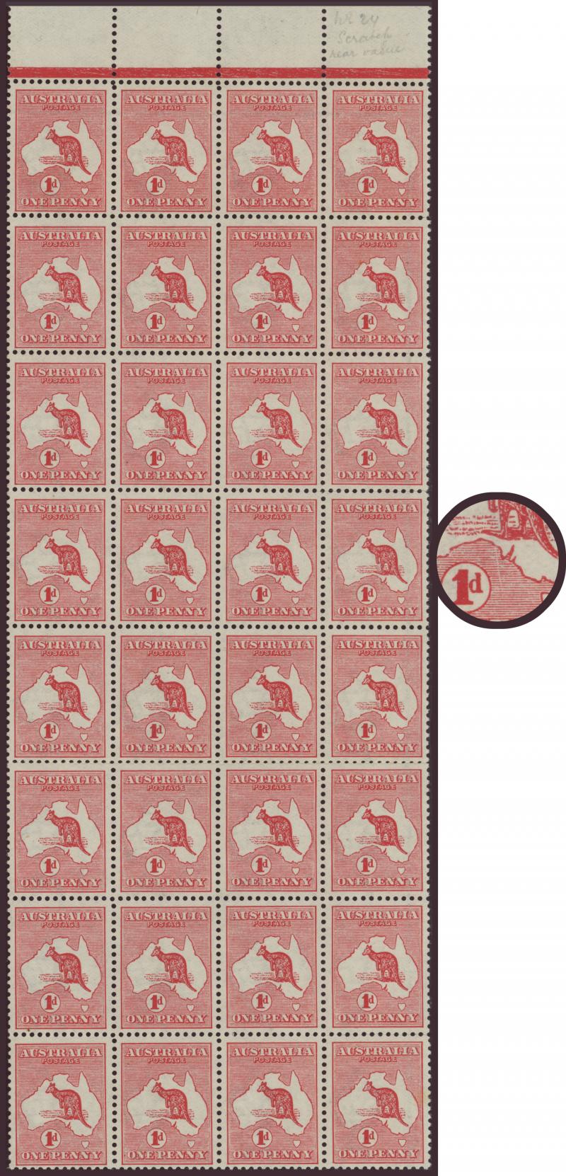 1d red Die I SG 2 top marginal block of 32 (4 x 8) from left pane of Sheet B with White Scratch in Bight variety ACSC 2(B)e [Pos