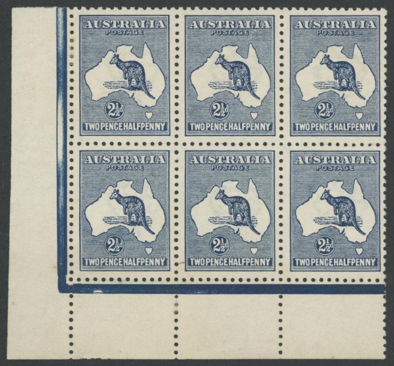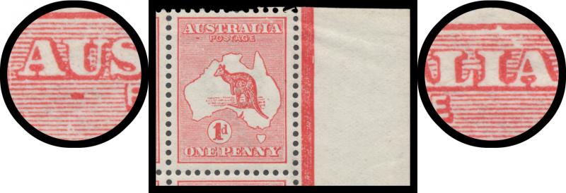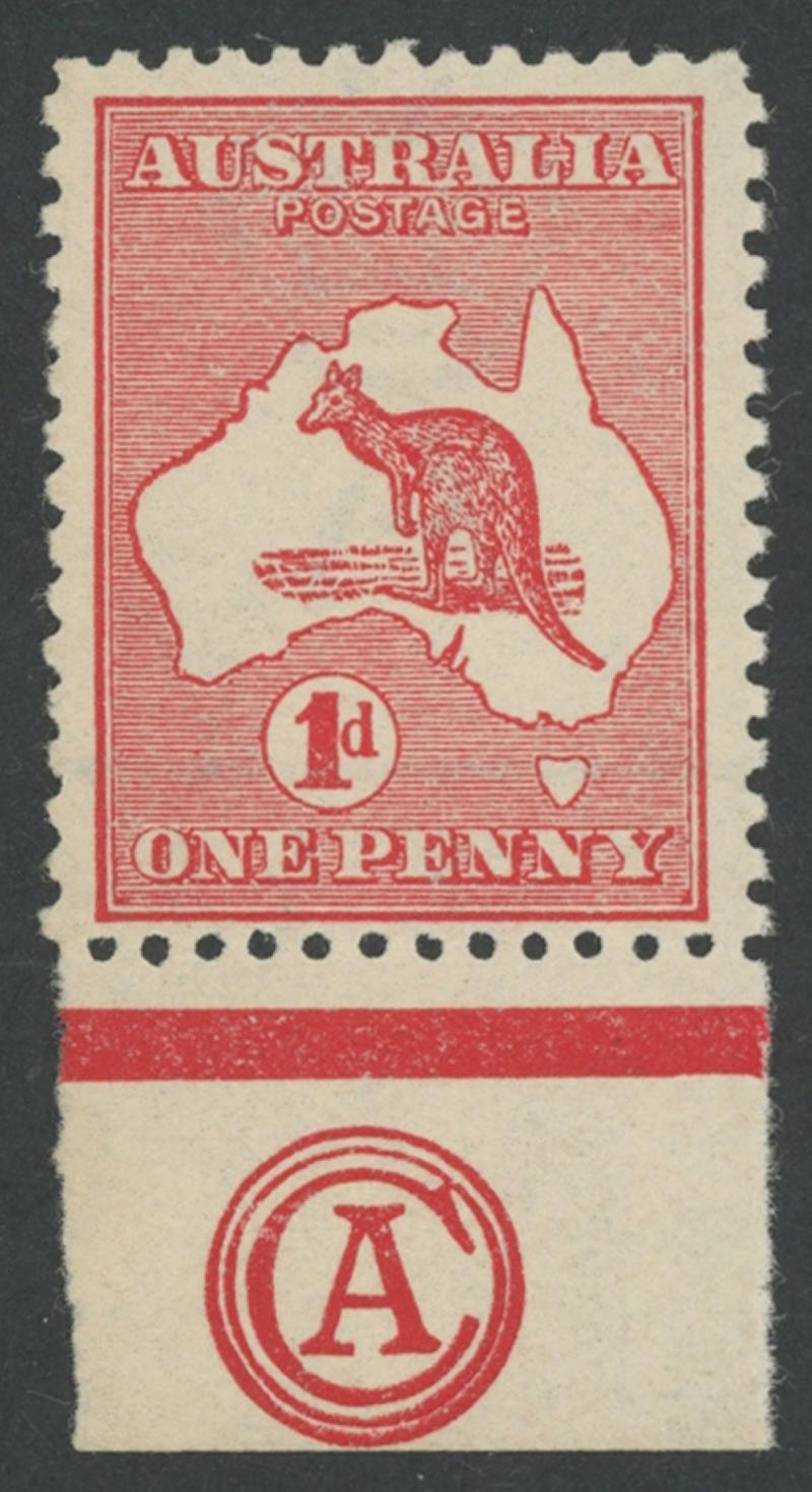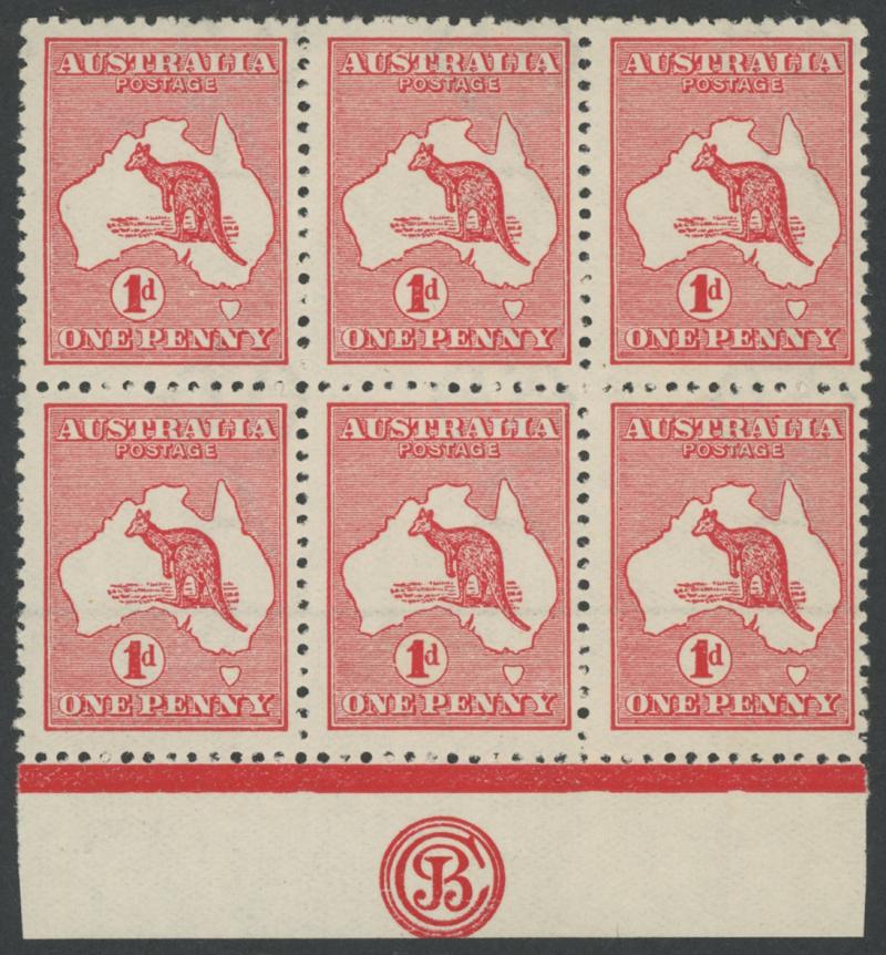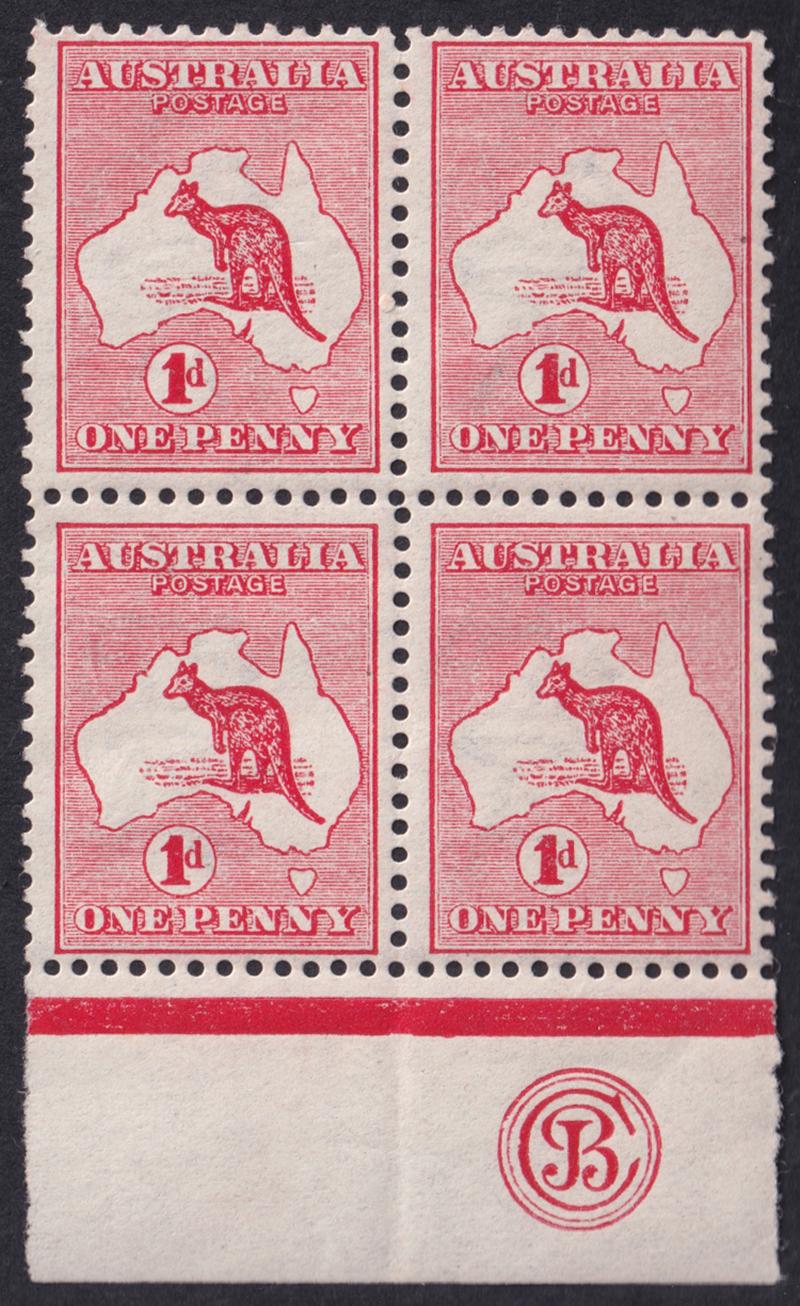 1d red Die I SG 2 top marginal block of 32 (4 x 8) from left pane of Sheet B with White Scratch in Bight variety ACSC 2(B)e [Pos