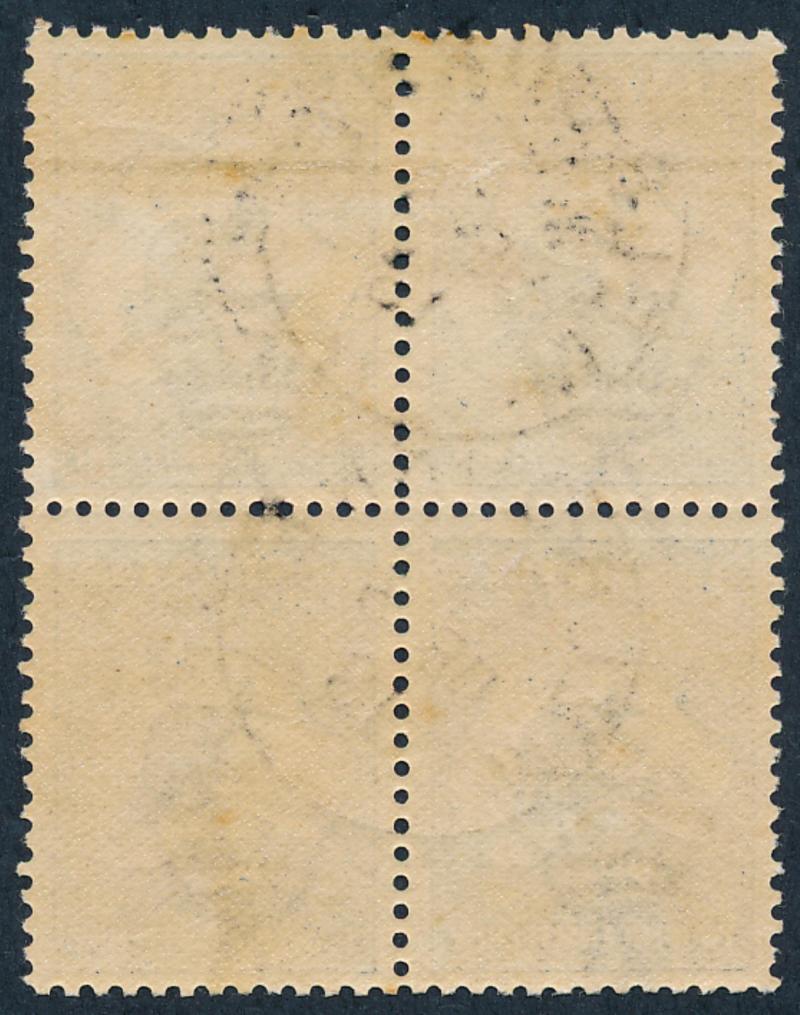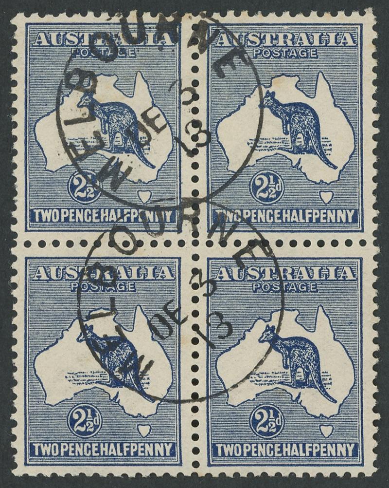 2½d indigo SG 4 block of 4 CTO with two complete strikes of Melbourne 'DE 3/13' cds ACSC 9wc, a couple of slightly uneven perfs at