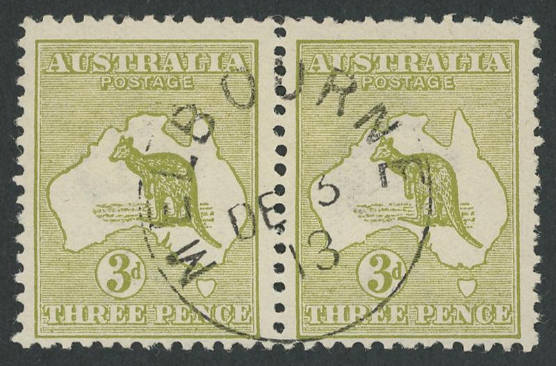 3d olive Die II-Die I horizontal pair SG 5ca CTO with a complete strike of Melbourne 'DE 3/13' cds ACSC 12wc/wd, the right-hand Die