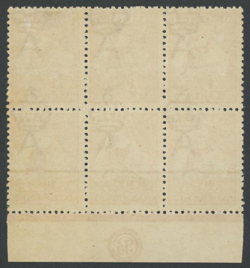 1d red Die I SG 2 Plate C '(lower-left) JBC' Monogram single ACSC 2(C)zc in a block of 6 (3x2), characteristic 'fluffy' perfs, two