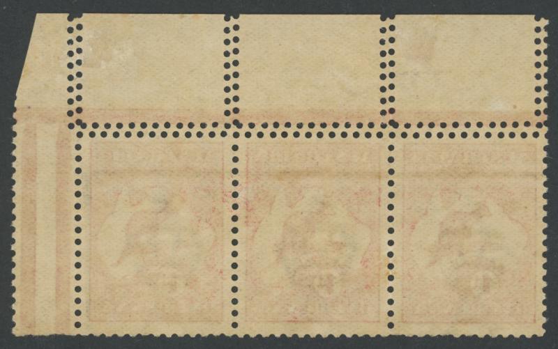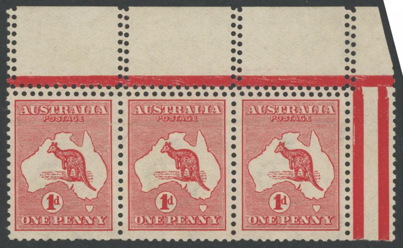 1d red Die I SG 2 Plate B Double Perforations in Upper Margin and Top of Stamps in marginal strip of 3 ACSC 2(B)b [Pos BL4-6], the
