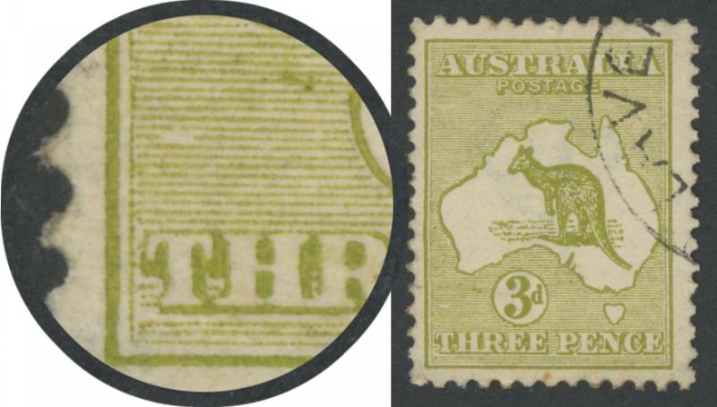 3d olive Die II SG 37d with White Flaw over 'T' of 'THREE' ACSC 12B(1)d, [Pos 1L55], light cds cancel well clear of the variety,