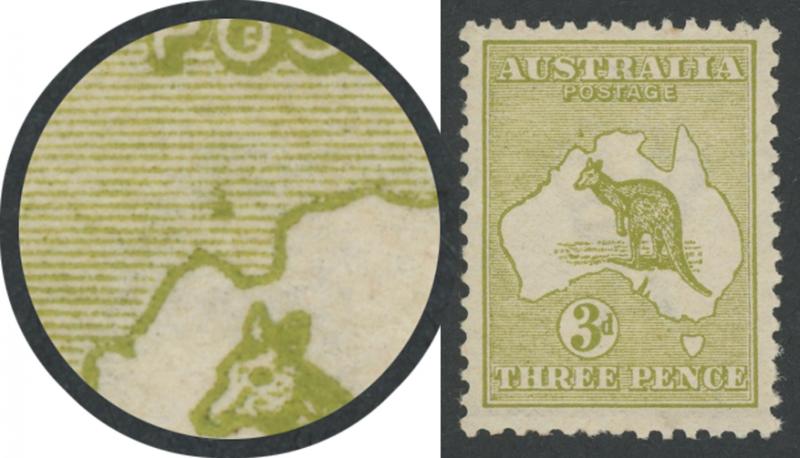design is most evident 1) down the right-hand frame-lines, where there is a significant distortion towards the base; 2) in the Gulf of Carpentaria and down the eastern coast; 3) along the back of the kangaroo; and 4) on the letters 'NCE' of 'THREE