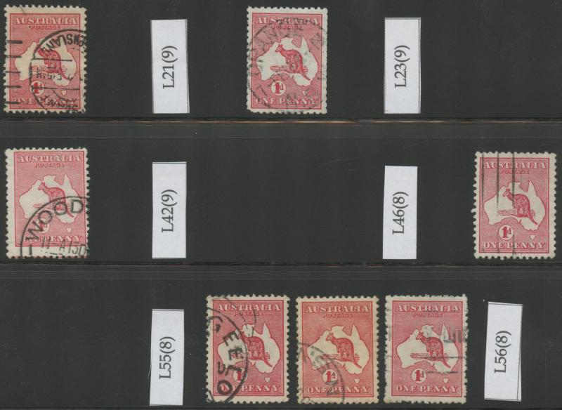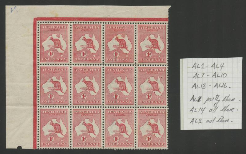 1d red Die I SG 2 range of Plate A varieties including block of 12 AL1-4,13-16 mint but some toning, 12 used including 2 Punctured