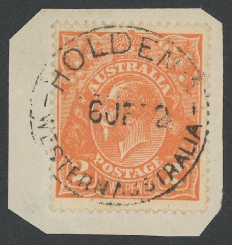Holdens: 'HOLDENS/6JE22/WESTERN AUSTRALIA' cds largely very fine complete strike on KGV 2d orange on-piece while RO only. RO