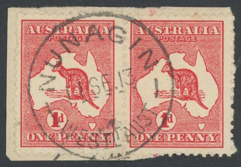 Nunagin: 'NUNAGIN/11SE13/WESTN AUST' cds very fine complete strike on Kangaroos 1d red pair on small piece. RO 1.10.1911; PO