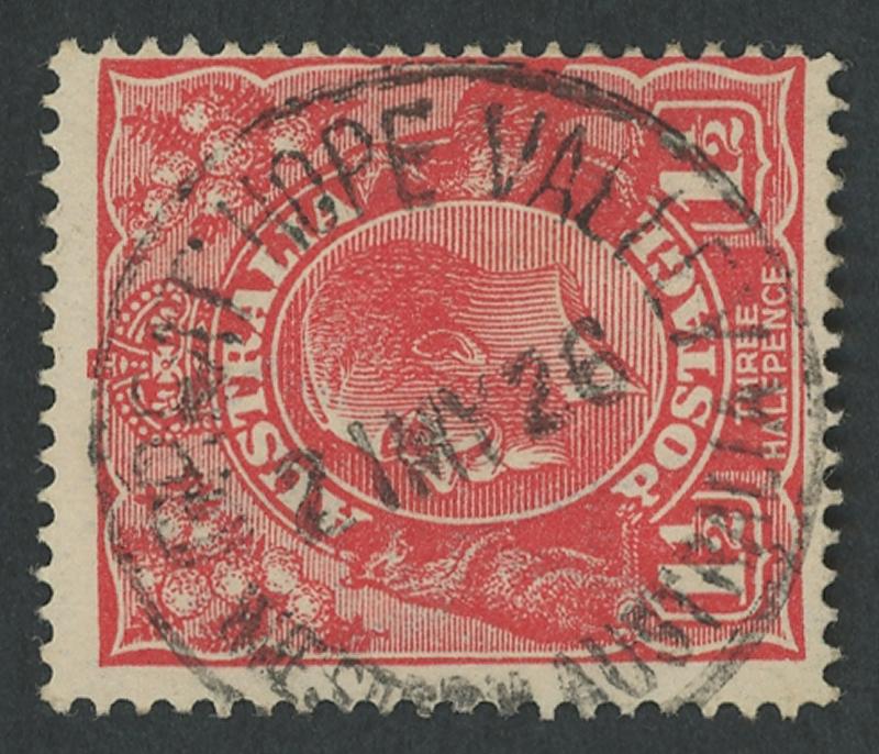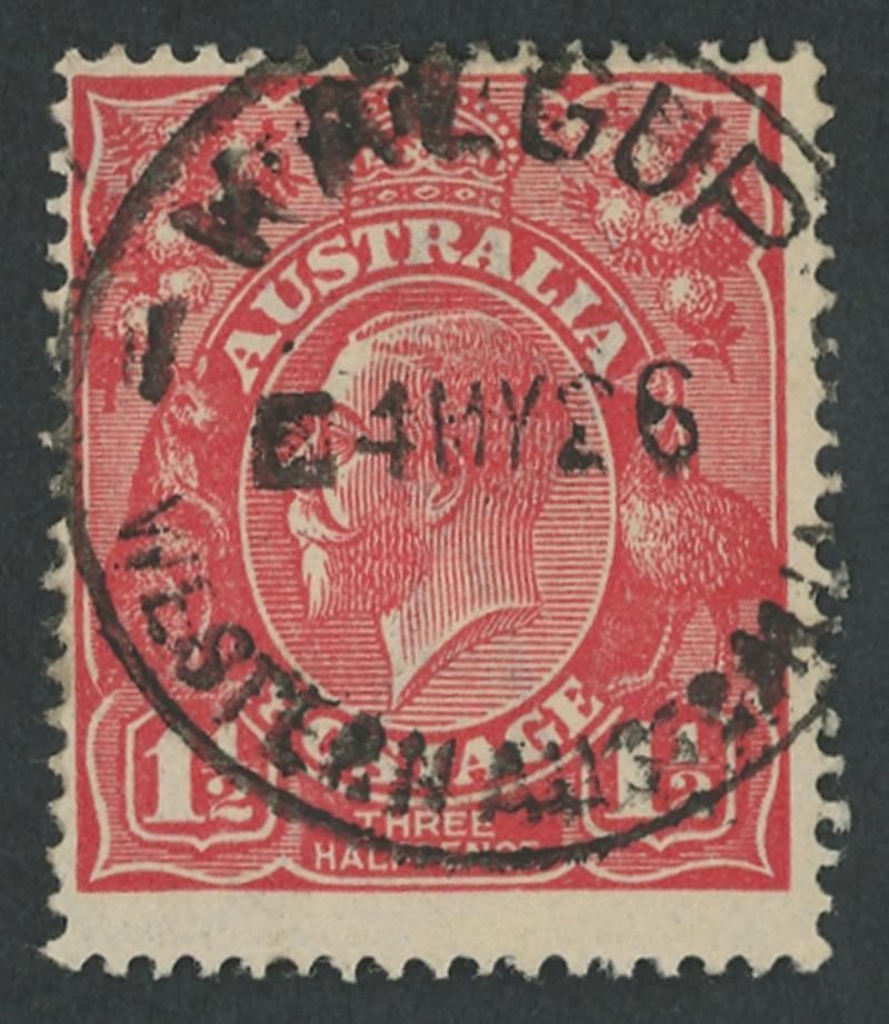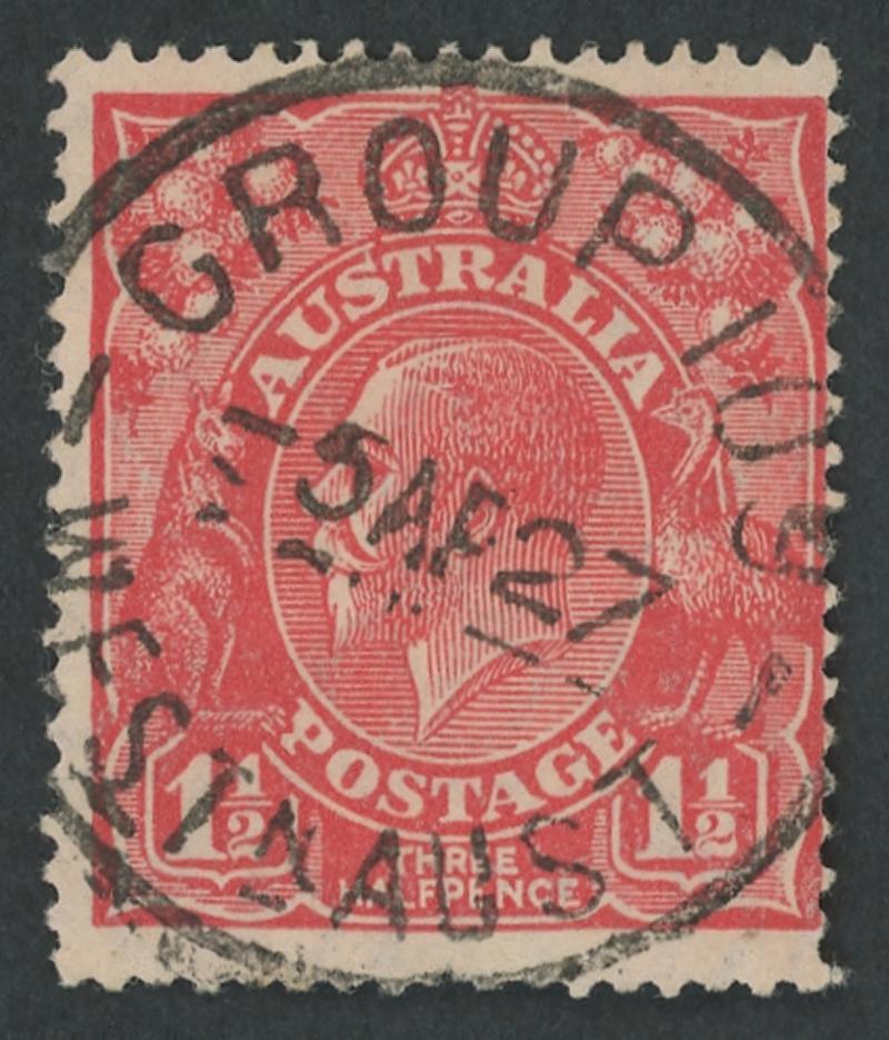 only. RO 1.11.1923; PO 1.7.1927; TO 11.9.1929 [Group Settlement 52; 14km SW of Busselton]. Superior to a light complete strike also on KGV 1½d red that sold at a Perth auction in 2021 for $265. (Image1) (Image2)