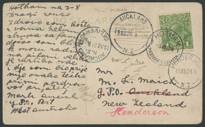 with message in Esperanto to "GPO Auckland, New Zealand" redirected with 'AUCKLAND/DELIVERY' transit & 'HENDERSON' arrival cancels alongside, a couple of minor bumped corners. PO 1.6.1922; RO 1.9.1926; closed 17.6.1927 [Railway Siding; 50km ESE of