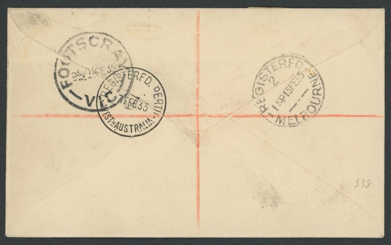 largely very fine strike on Stationery Society philatelic cover registered to Victoria with large blank red/white R label endorsed "Karrakatta/6/2/35", Perth & Melbourne transits and Footscray arrival backstamps, a couple of very minor blemishes. RO