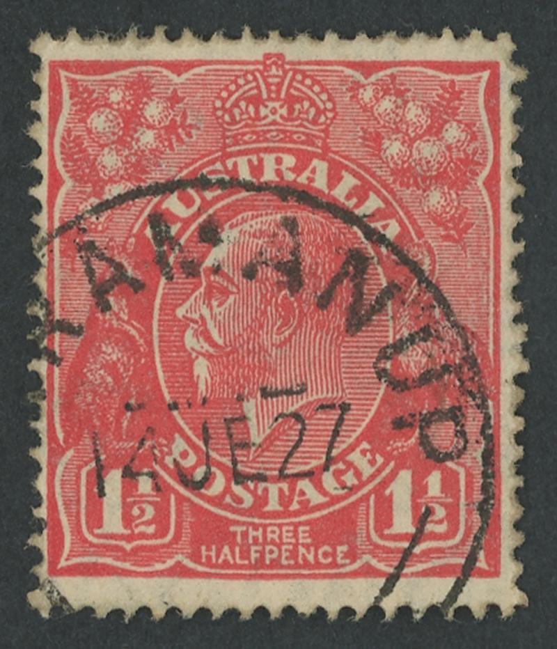 Marmanup: '[MA]RMANUP/14JE27/[W.A]' cds very fine partial strike on KGV 1½d red while Receiving Office only. RO 1.8.1924; PO