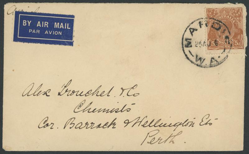 Mardie: 'MARDIE/25AU36/W.A' cds largely very fine complete strike tying KGV 5d brown to cover airmail to Perth, a couple of minor