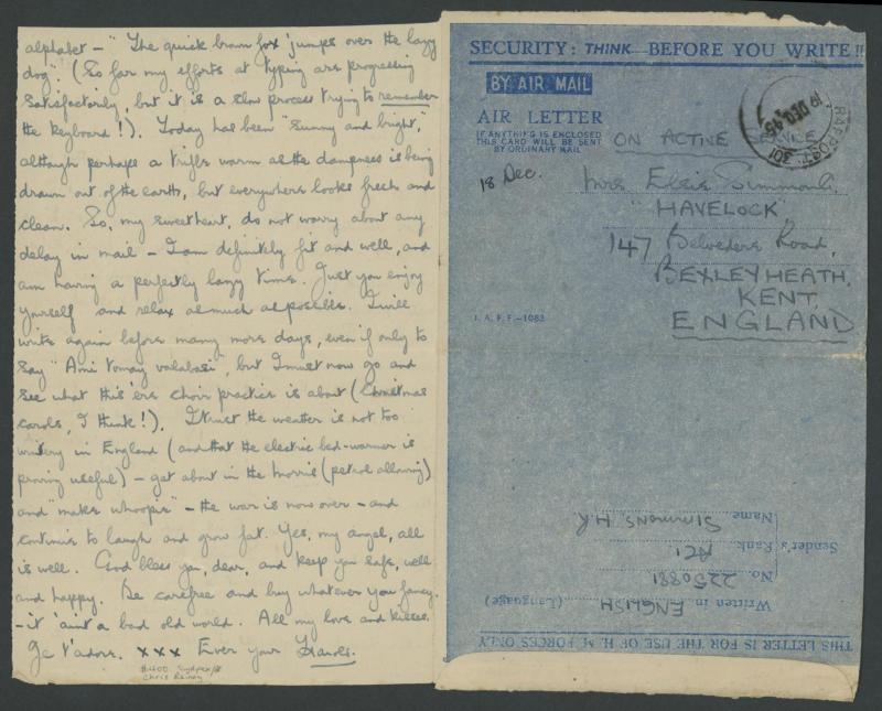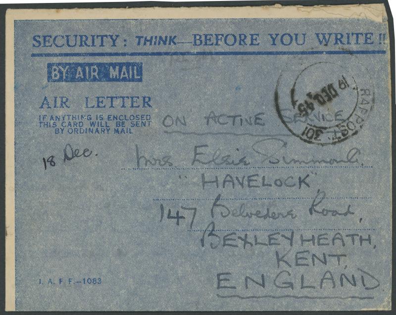 1945 (Dec 18) Indian-pattern Forces Air Letter headed 'SECURITY: THINK - BEFORE YOU WRITE!!' to Kent with an above-average strike