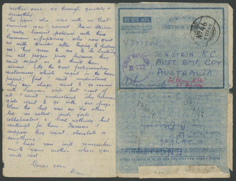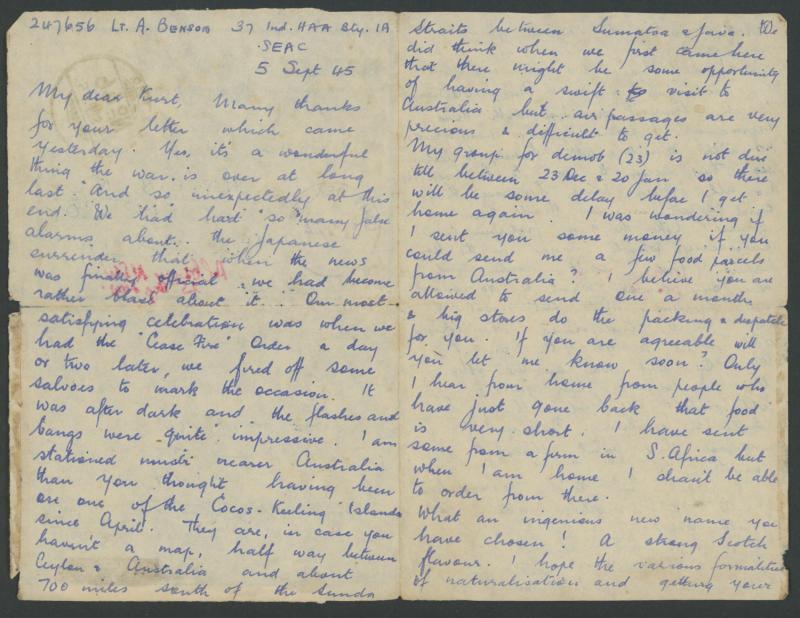 used on Cocos, to a member of "8 Aust Emp Coy/AUSTRALIA", self-censored by Lt Alan Benson who states "... the war is over at long last ... air passages are very precious & difficult to get ... could [you] send me a few food parcels ... big stores do