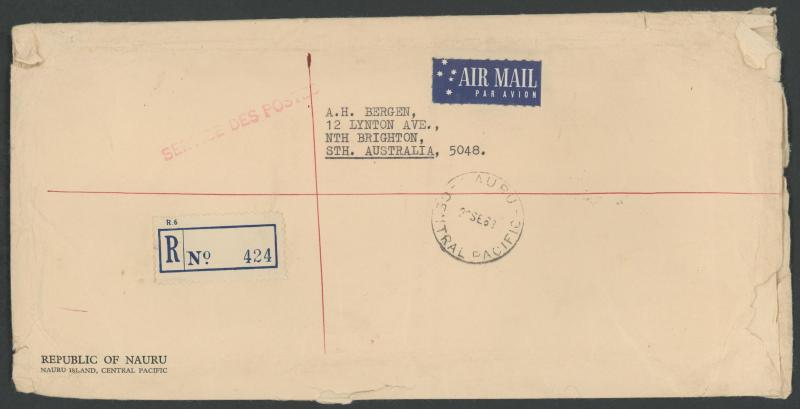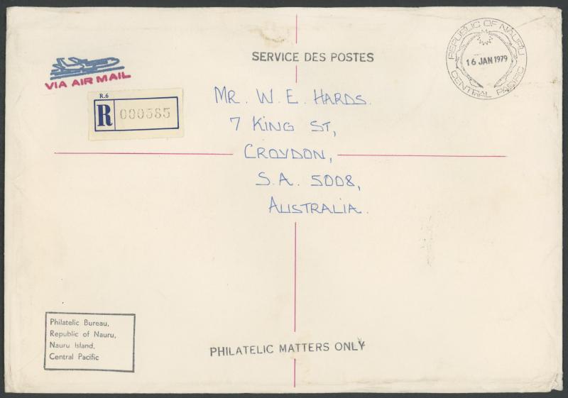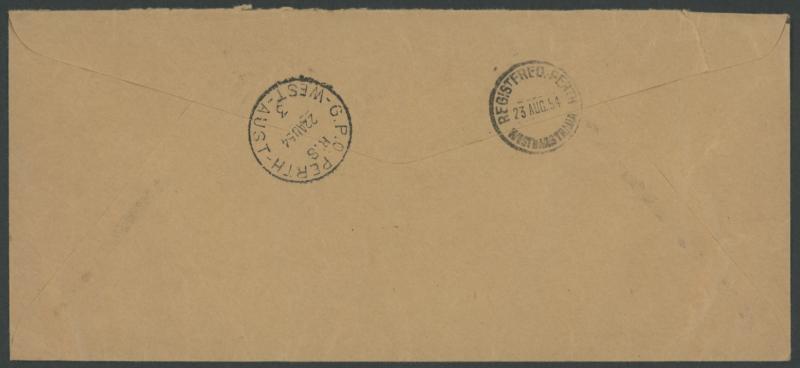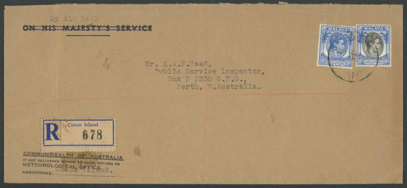 50c tied by partial Malayan-pattern 'COCOS/ISLAND' cds, blue & black/white 'Cocos Island' R label, superb 'GPO PERTH/ RS/22AU54/ 3 /WEST-AUST' arrival backstamp, minor wrinkles. There was no Straits period OHMS cover, or registered cover, in Colin