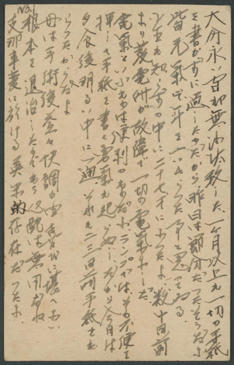 address obliterated & censor's han in scarlet, full message states (translated) "...situation is getting worse...I read Buddhist words and believe very much...Though we can't [get] enough food, clothes and habitation, we are full of fighting