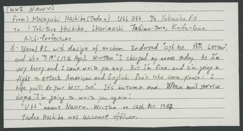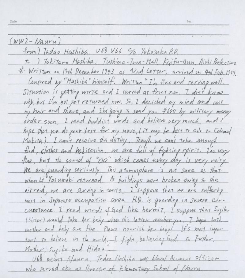 spirit..." Docketed (translated) "Written 19 Dec 1943; received 4th Feb 1944". The writer, Tadao Hashiba, was a Naval Accounts Officer and also director of the primary school on Nauru. (Image1) (Image2)