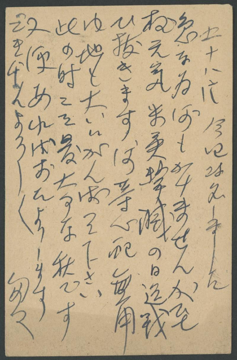 cachet in magenta & censor han in scarlet, full message states (translated) "...I changed my name today [ ? ]...I'm going to fight to attack American and English...When mail service come I'm going to write to you again". The writer, Tadao Hashiba,