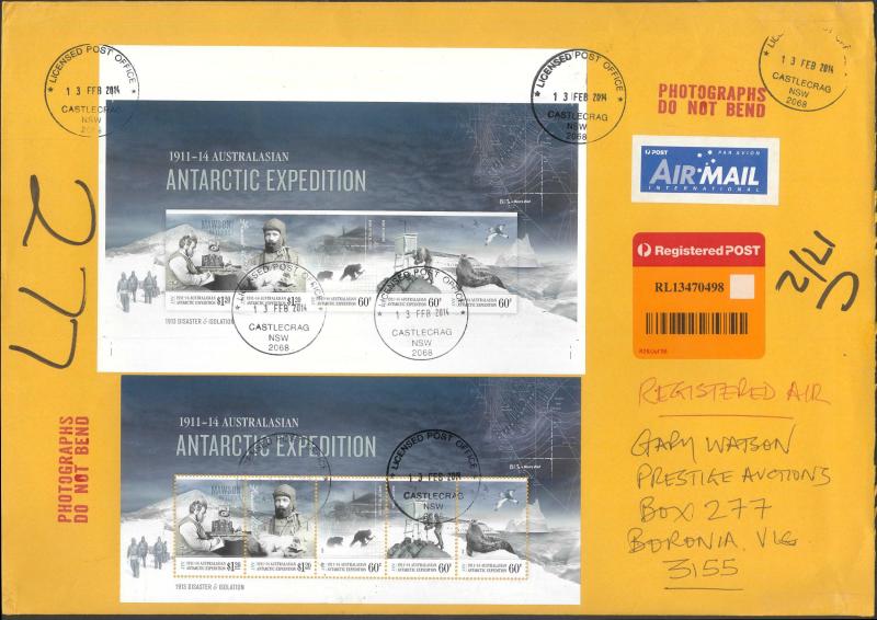 AUSTRALIAN ANTARCTIC TERRITORY: 2013 Antarctic Expedition Centenary perforated & Imperforate M/Ss on oversize 2014 registered