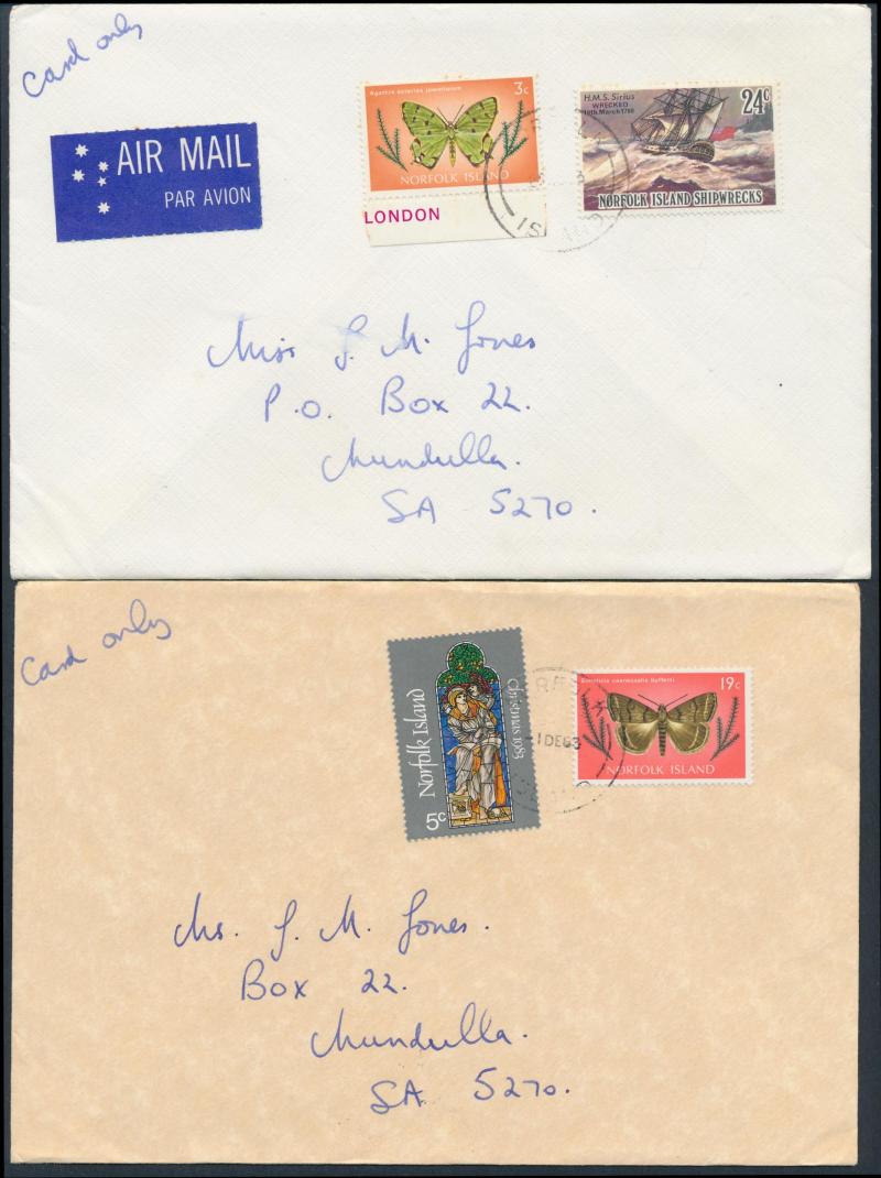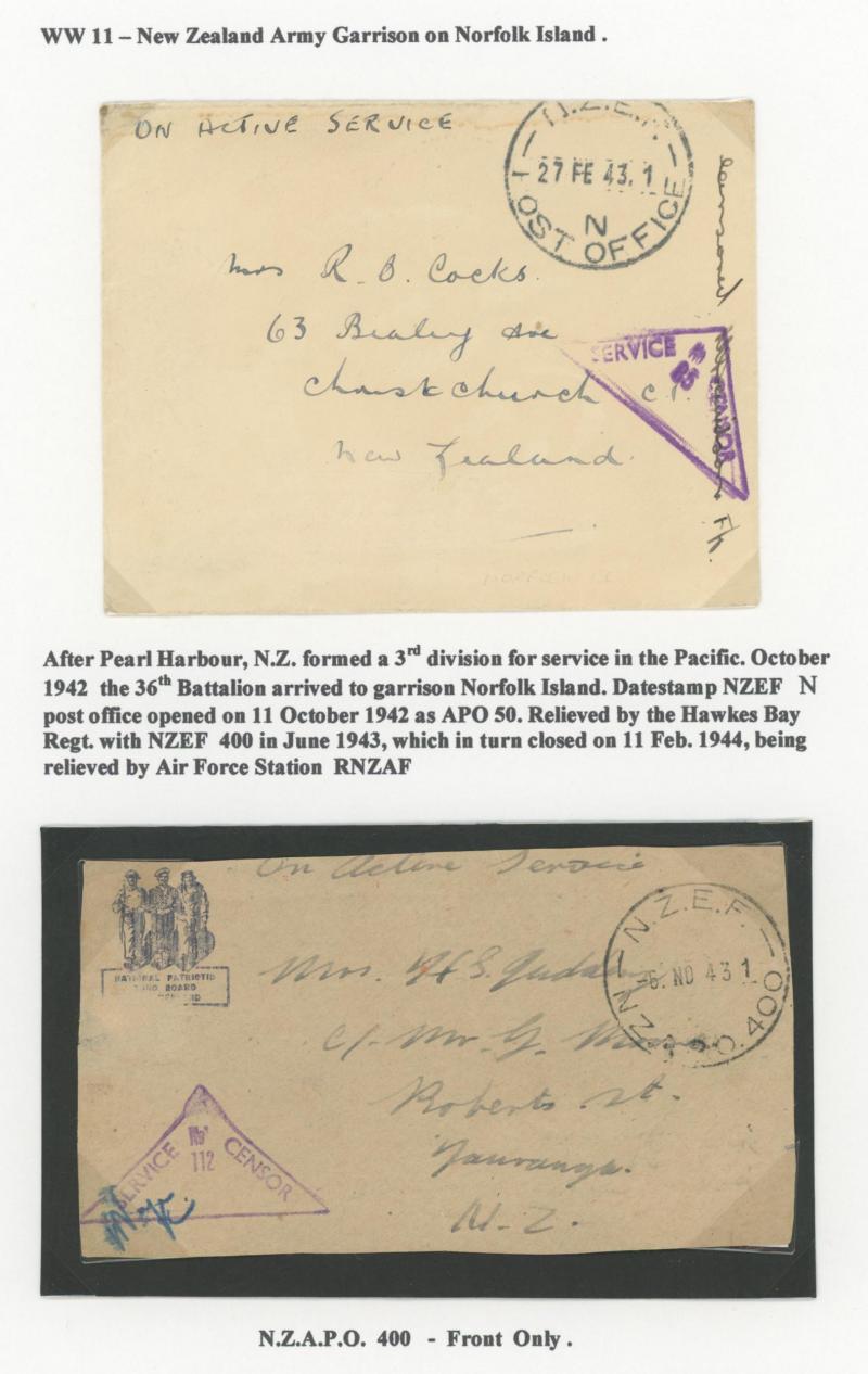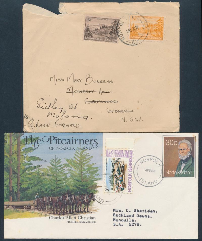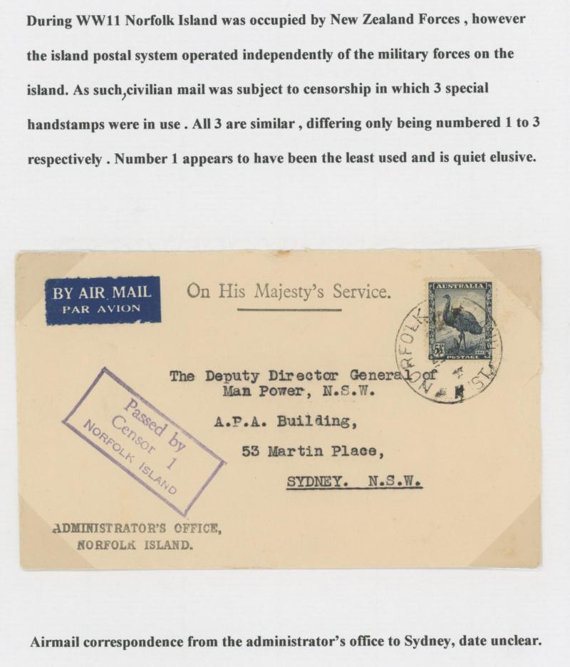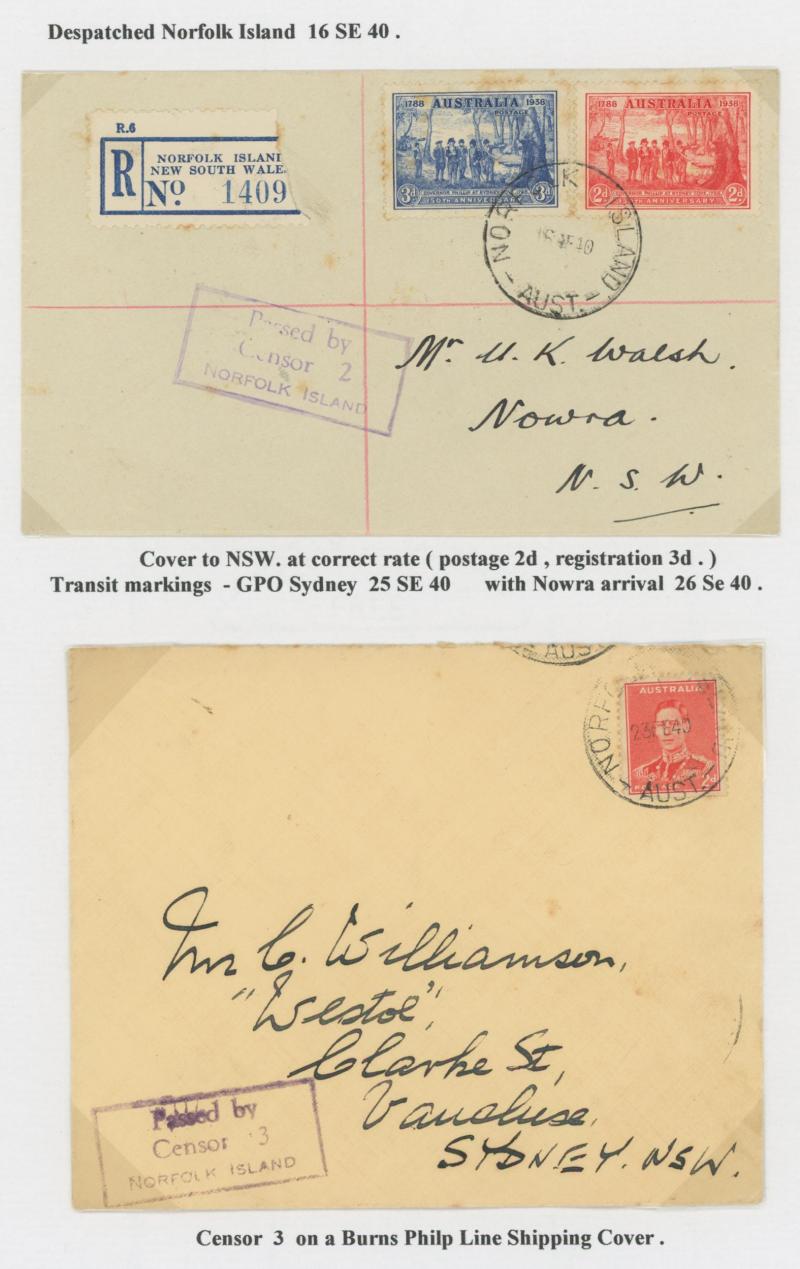 NORFOLK ISLAND - POSTAL HISTORY: Partly-annotated group including WWII with boxed Censor Nos 1 x2 (one registered to Curacao) 2 &