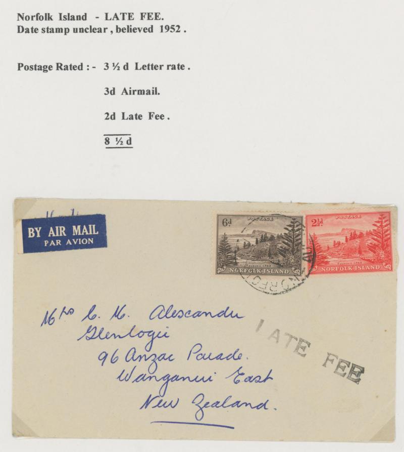 3, 1943 New Zealand Forces x2 (one a front only) & 1948 late usage airmail to Auckland, circa 1952 airmail to NZ with 'LATE FEE' handstamp, 1965 commercial local letter at 1d rate, 1966 social usage of PPC to NSW with 4c on 5d Flower, 1998 philatelic