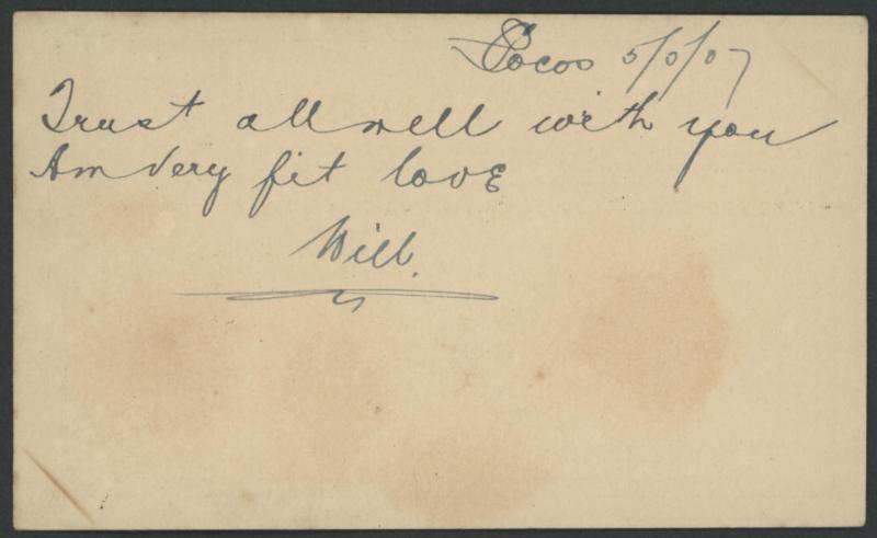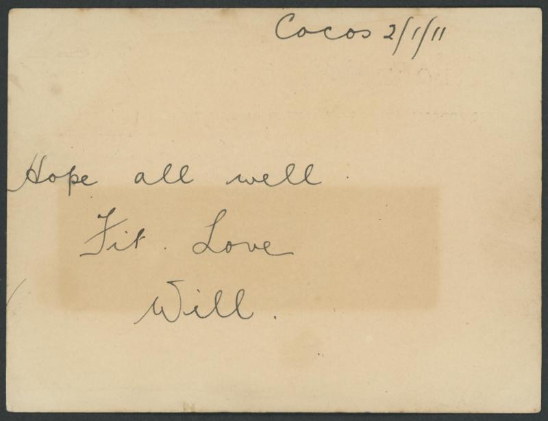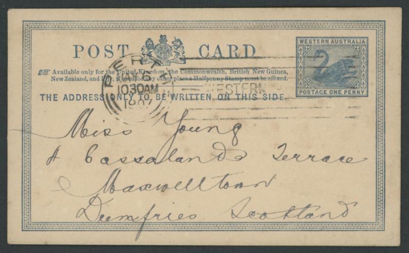 an unusually significant item. Items like this were once thought to have originated on Cocos. It is now recognised that telegraphic messages were sent from Cocos to Perth where they were transcribed onto postal cards and then placed in the mail. (Image1) (Image2)