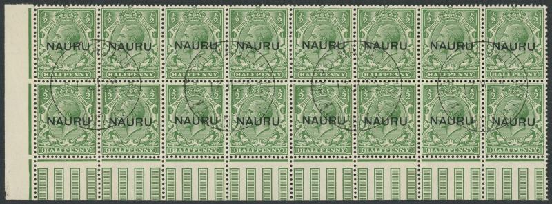 of 16 (8x2) & 64 (8x8), some minor characteristic bends, all CTO with 'PO NAURU/PLEASANT ISLAND' cds of '1DE22' (1d) or '13JL23' (½d) with full unmounted gum, Cat £5300+ for singles.