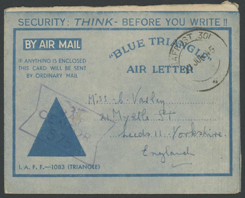 1945 (June 27) use of Forces Blue Triangle Air Letter with letter headed "Section 301, Ceylon Air Forces", to Yorkshire, England