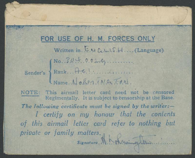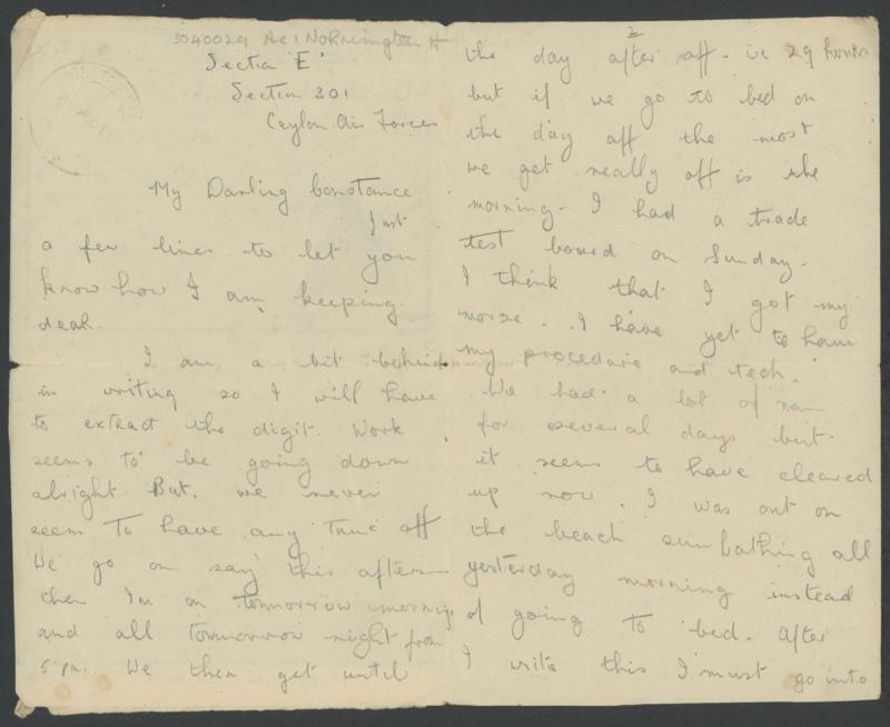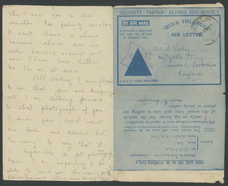 is impossible to get photographs here", minor blemishes. [A Command Administration memo of 3.6.1945 advised all personal mail for the Cocos Islands should be addressed "Section 301, RAF, Ceylon Air Forces"] (Image1) (Image2)