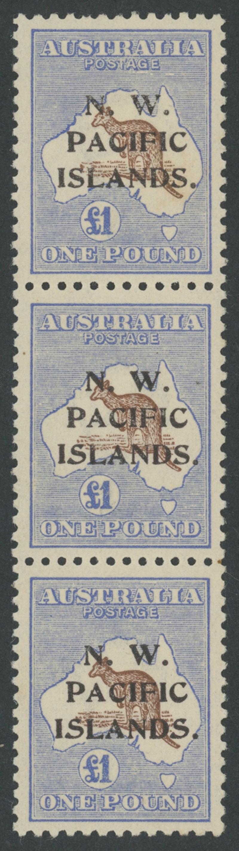 1915-16 Overprints on Kangaroos Third Watermark £1 red-brown & blue SG 99 Types abc vertical strip of 3, quite well-centred, the a