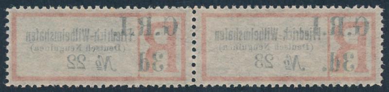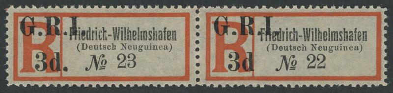 Neuguinea)' SG 35 horizontal pair "No.23" & "No.22", the right-hand unit with No Stop after 'd' of '3d' SG 35a, well-centred, unused, Cat £700+ for singles. Scarce se-tenant multiple. (Image1) (Image2)