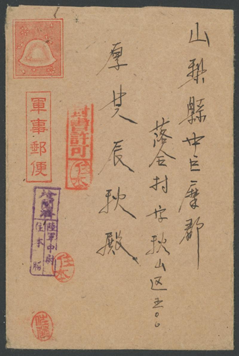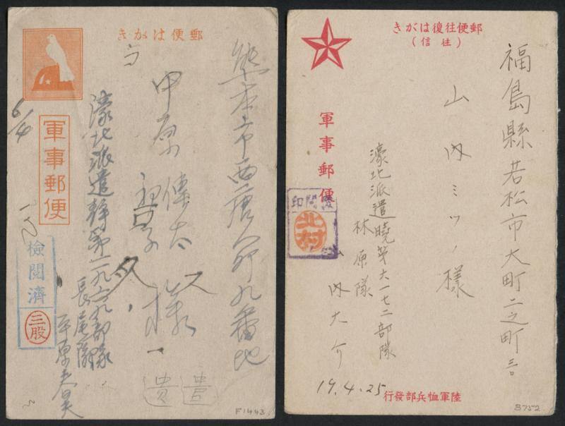 POSTAL HISTORY: 1943-44 Japanese Occupation Forces postal cards with Dove & Helmet (from 46 Div Field Hospital) or Red Star (from