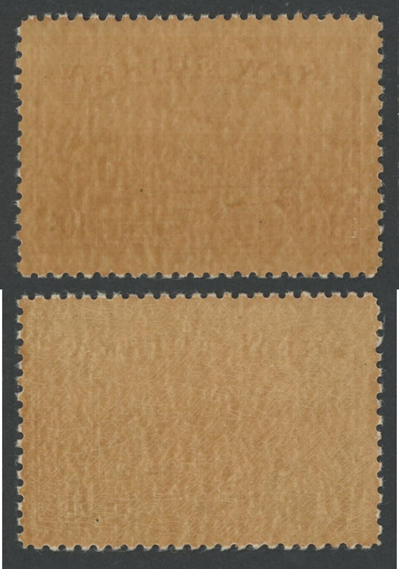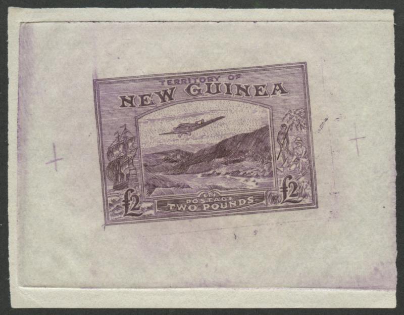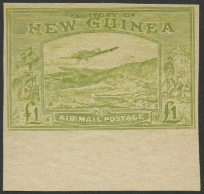 die, and similar for 1939 Bulolo £1 in yellow-olive reduced to stamp-size with margin at base.