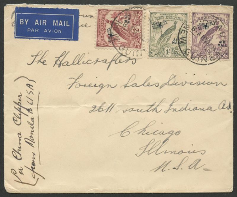 Undated Airs 9d 1/- & 2/- tied by Rabaul cds, light central horizontal fold. This was not a regular service from Australia, suggesting that the cover was taken by sea from Rabaul to Manila. (Image1)