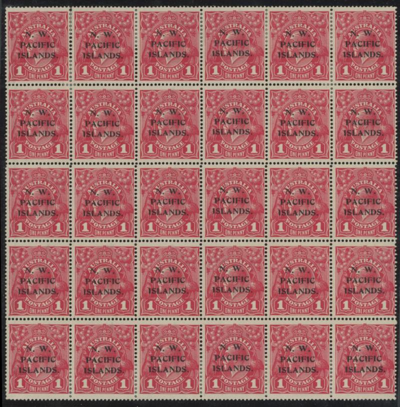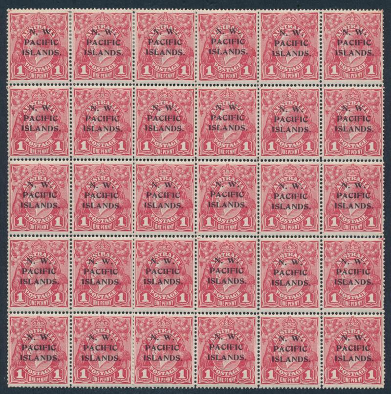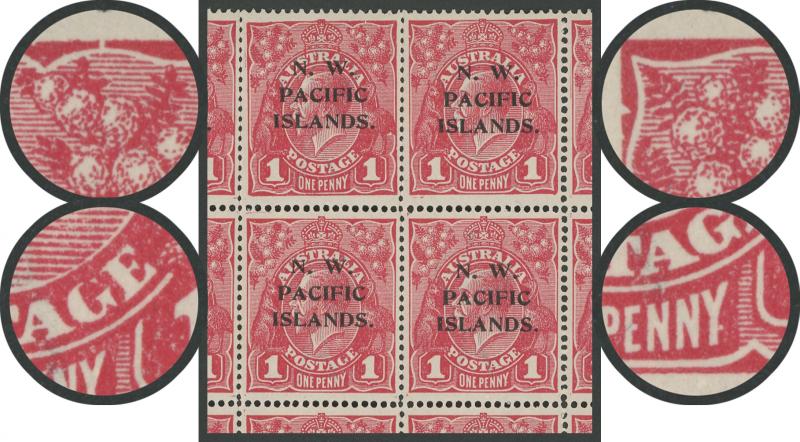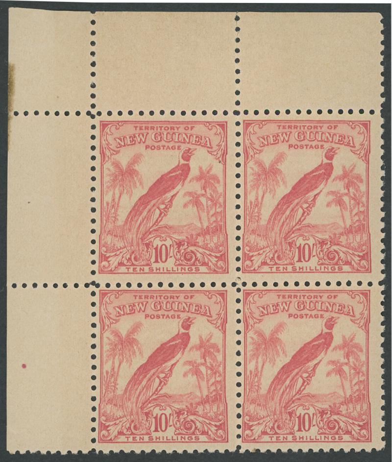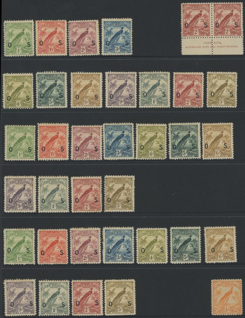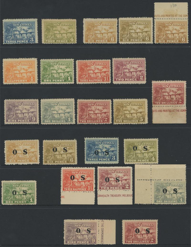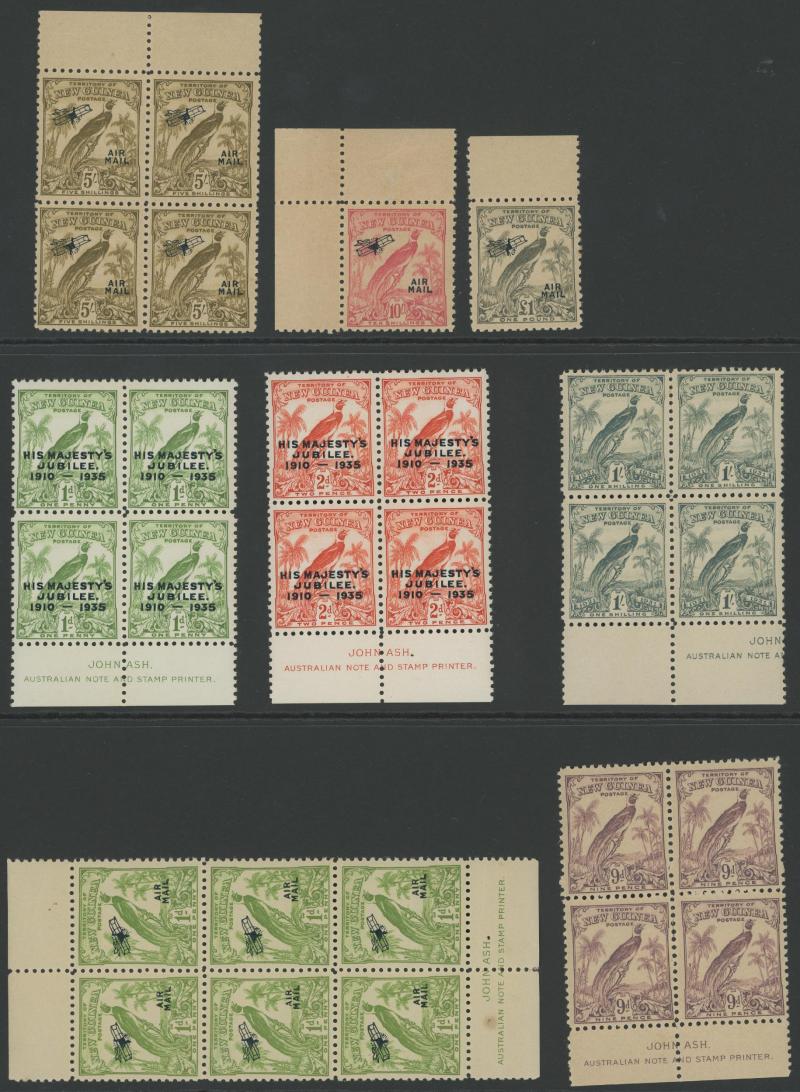 block of 4 and £1 single, 'AIR MAIL' overprints 10/- & £1 and 'OS' overprints 2½d green John Ash Imprint block of 4, Bulolo Airmails 5/- x2 £1 x2 and £2 violet x3, etc, some postmark interest noted 'MINING WARDEN' fiscal in violet on Huts 1½d, a few