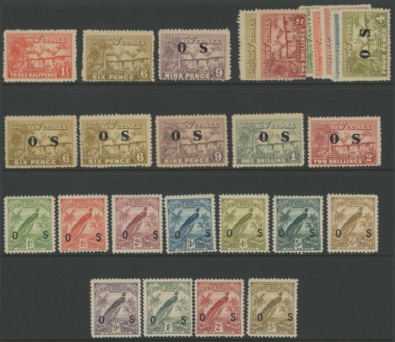 block of 4 ** and £1 marginal single **, and 'OS' overprints set x3, 1939 Bulolo Airmails set plus extras including 2/-, 5/- & £1, etc, quite a number are unmounted, some with adhesion (those affected not counted) and a few others with minor
