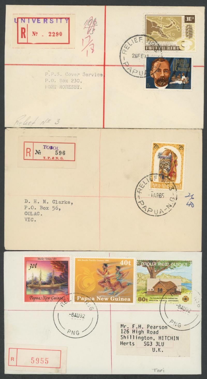 stamps, 'RABAUL AIRPORT' & 'WEST GOROKA' (both very scarce registered), many tied Relief cds to 1990s, a few errors including 1989 'WARDSTRIP' that we haven't seen before, group of very scarce registered commemorative covers, a few military, array of