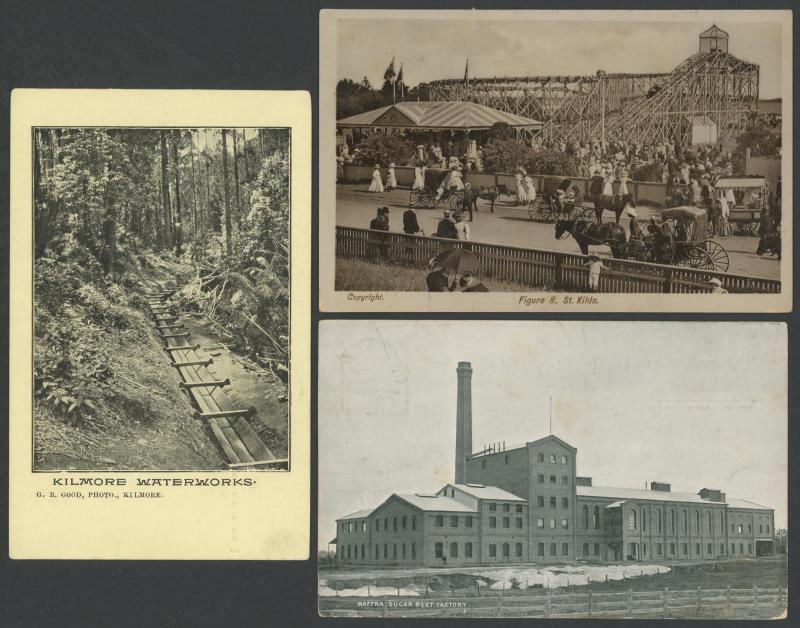 'Kilmore Waterworks', 'Maffra Sugar Beet Factory', 'Narrow Gauge Rly Gembrook' (workers on hand-trolleys), 'Figure 8 St Kilda' (roller-coaster), real photo types 'Seymour in Flood Aug 14-15' (old jalopy being driven through floodwaters) & 'Post